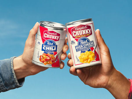 Another newbie this fall is aimed at those who like to snack while watching football games on television. Looking for a unique dip to scoop with those chips? How about a Campbell's Chunky Soup and Pabst Blue Ribbon combo? The brands have teamed up to create two flavors that aim to bring together the craveability of Chunky and the smooth taste of Pabst Blue Ribbon.”